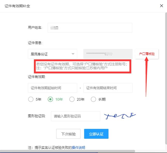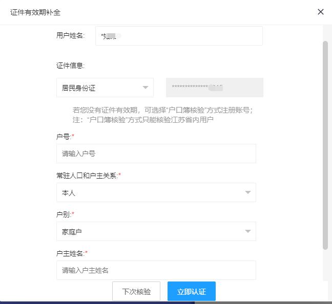 點擊“證件信息”右側“戶口簿核驗”,根據頁面提示填寫相應戶口簿信息后點擊“立即認證”,完成證件有效期補全。