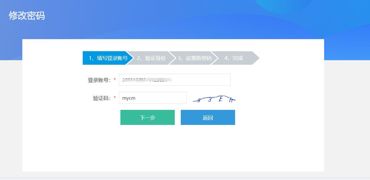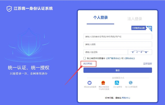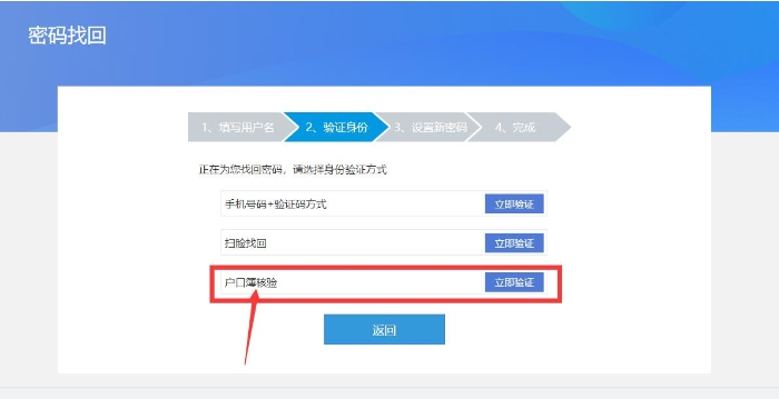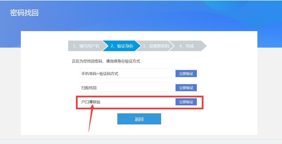 3、找回密碼:如您遺忘密碼,個人登錄頁面點擊“找回密碼”。“登錄賬號”中填入身份證號碼,經判斷為未成年人時,可選擇“戶口簿核驗”方式進行找回。