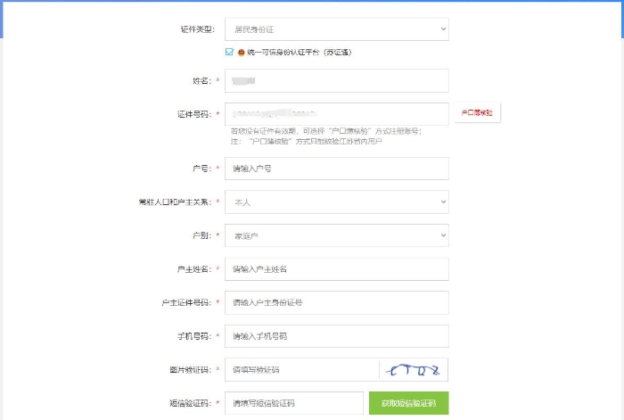 輸入身份證號碼后,點擊右側彈窗的“戶口簿核驗”,根據頁面提示填寫相應的用戶信息、戶口簿信息、圖形驗證碼和短信驗證碼,設置密碼后完成注冊。